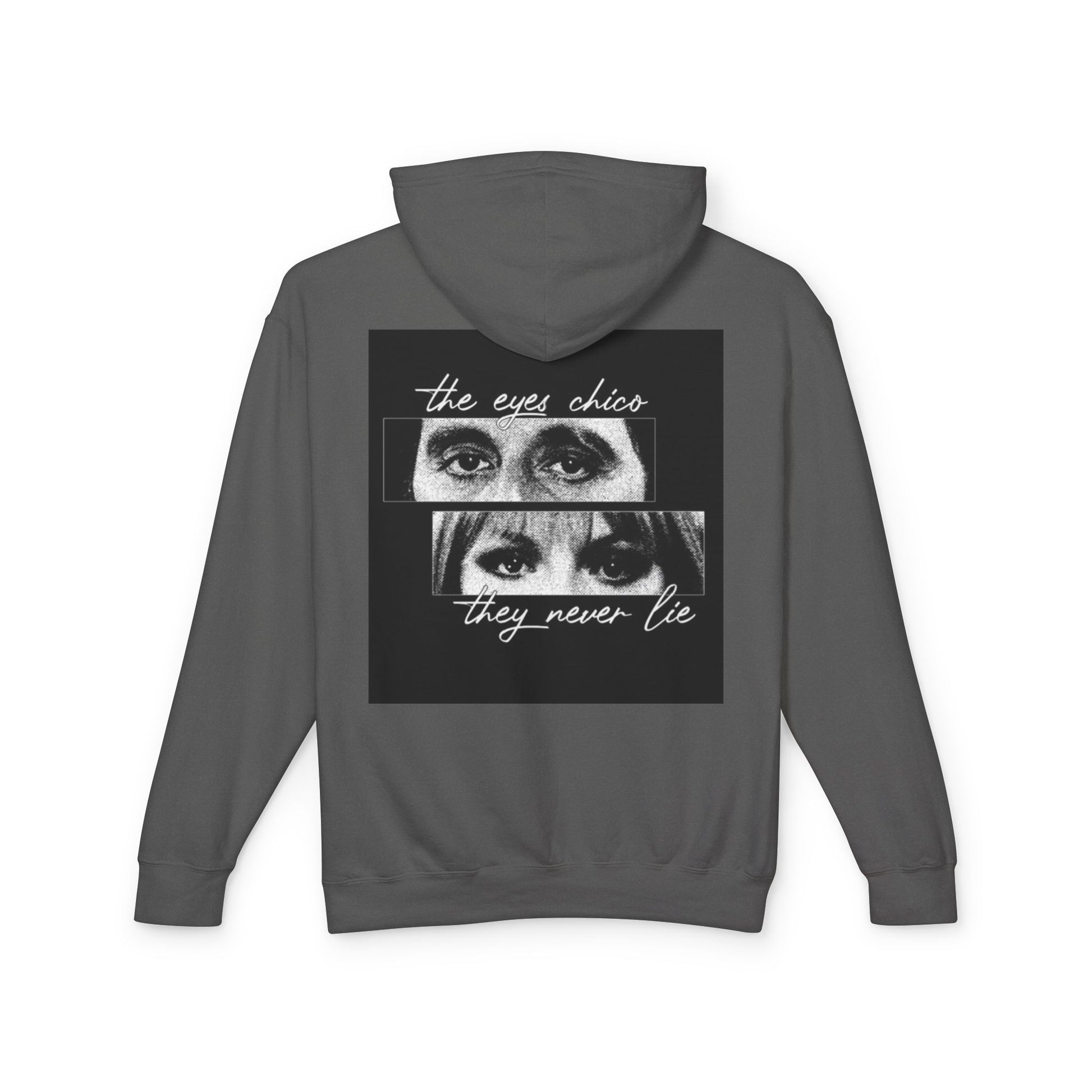 A soft, lightweight hooded sweatshirt made to be lived in. The relaxed silhouette and jersey-lined hood settle in like a familiar companion — comfortable enough for slow mornings and bold enough to carry a graphic statement on the back. The monochrome artwork frames two haunting pairs of eyes with the whispering line “the eyes chico, they never lie,” giving the piece a cinematic, slightly noir vibe. Wear it over a tee for layered warmth on city nights, or throw it on after a long day when you want something that feels both worn-in and considered. The natural flatcord and clean pigment dyes keep the look intentionally simple so the design reads loud and clear.